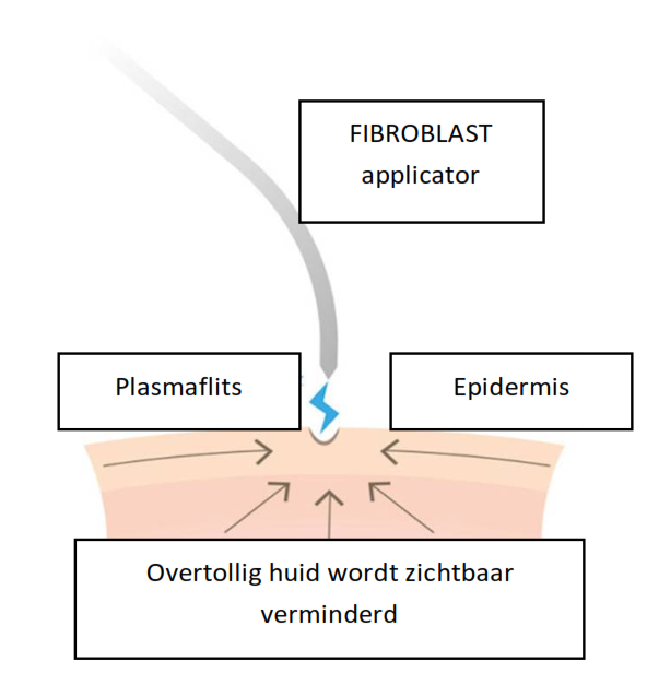 Het fibroblast apparaat produceert aan het uiteinde van de applicator een kleine plasmatische flits. De flits springt vervolgens over op de huid en laat het verdampen, er ontstaat een klein puntje ter grote van een micromillimeter. Het puntje minimaliseert de huid en de directe omgeving. Verschillende puntjes worden strategisch geplaatst en afhankelijk van het gebied wordt er een patroon gekozen. Het gevolg van deze strategische plaatsing is dat de puntjes de overtollige huid zichtbaar verminderen.